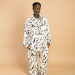 Details: Oversized button-down shirt with wide‑leg pants; abstract cream/black brushstroke print