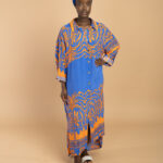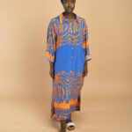 Details: Vibrant cobalt/orange palm print; relaxed fit
